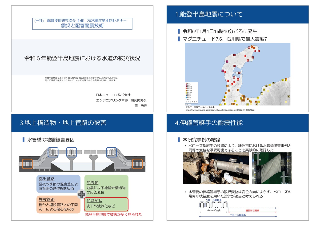 セミナーは地上・屋内配管と埋設配管に対する耐震化の最新情報として6つのテーマでそれぞれ講師が登壇し、当社からも「令和6年能登半島地震における水道の被災状況」と題して発災直後に調査した被害事例や伸縮管継手の耐震性能について解説いたしました。