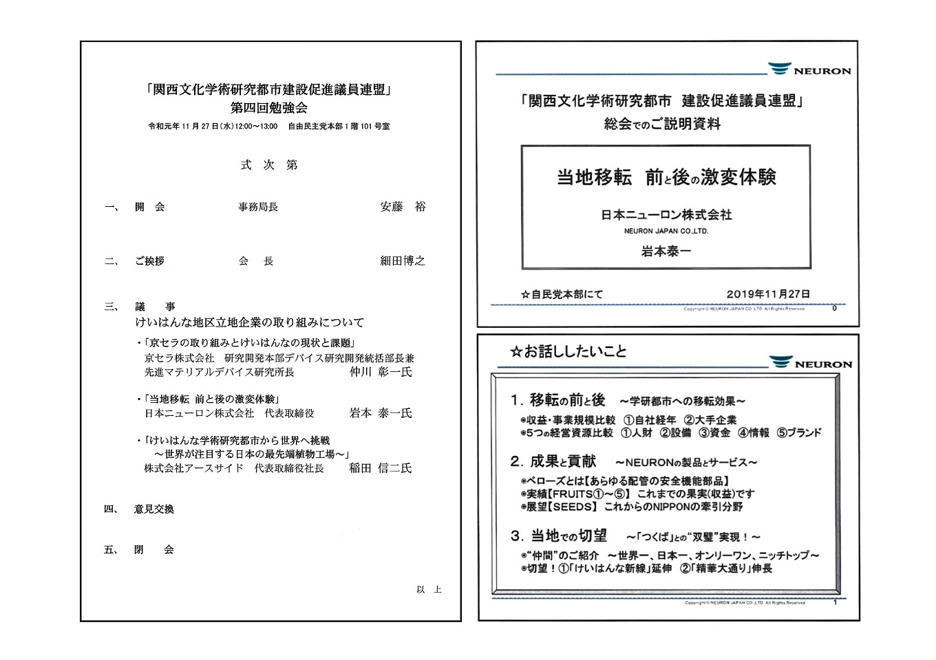 その中で当社社長は、“学研都市への移転効果”と題し、その恩恵に対する感謝を述べ、次題“NEURONの製品とサービス”では、当社業容取組と社会への貢献内容を説明いたしました。